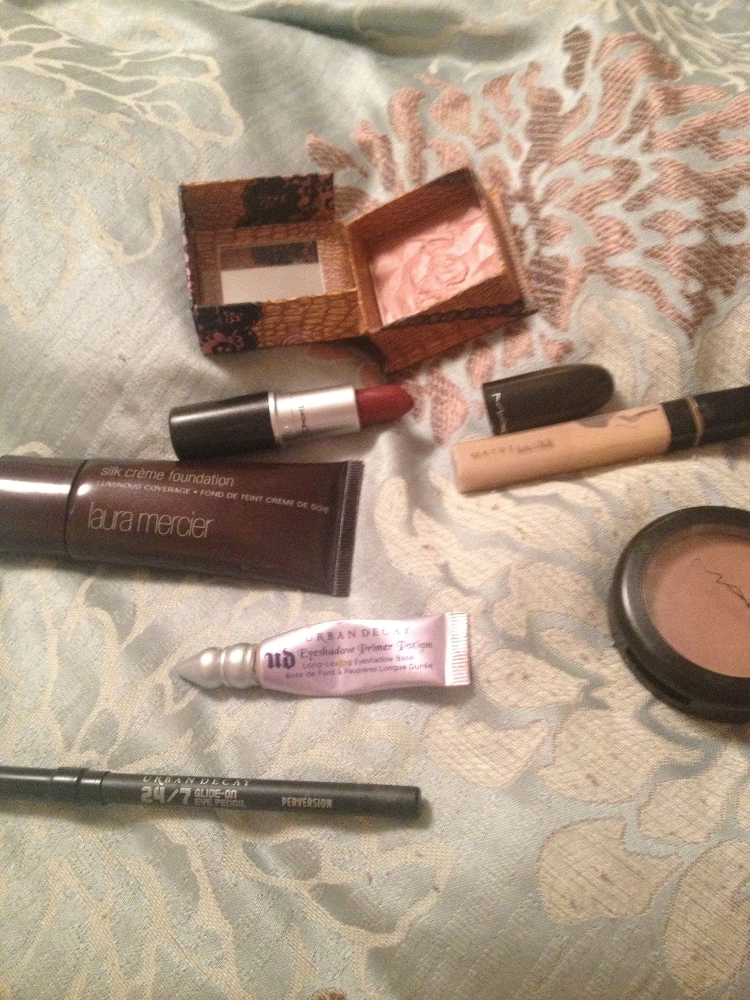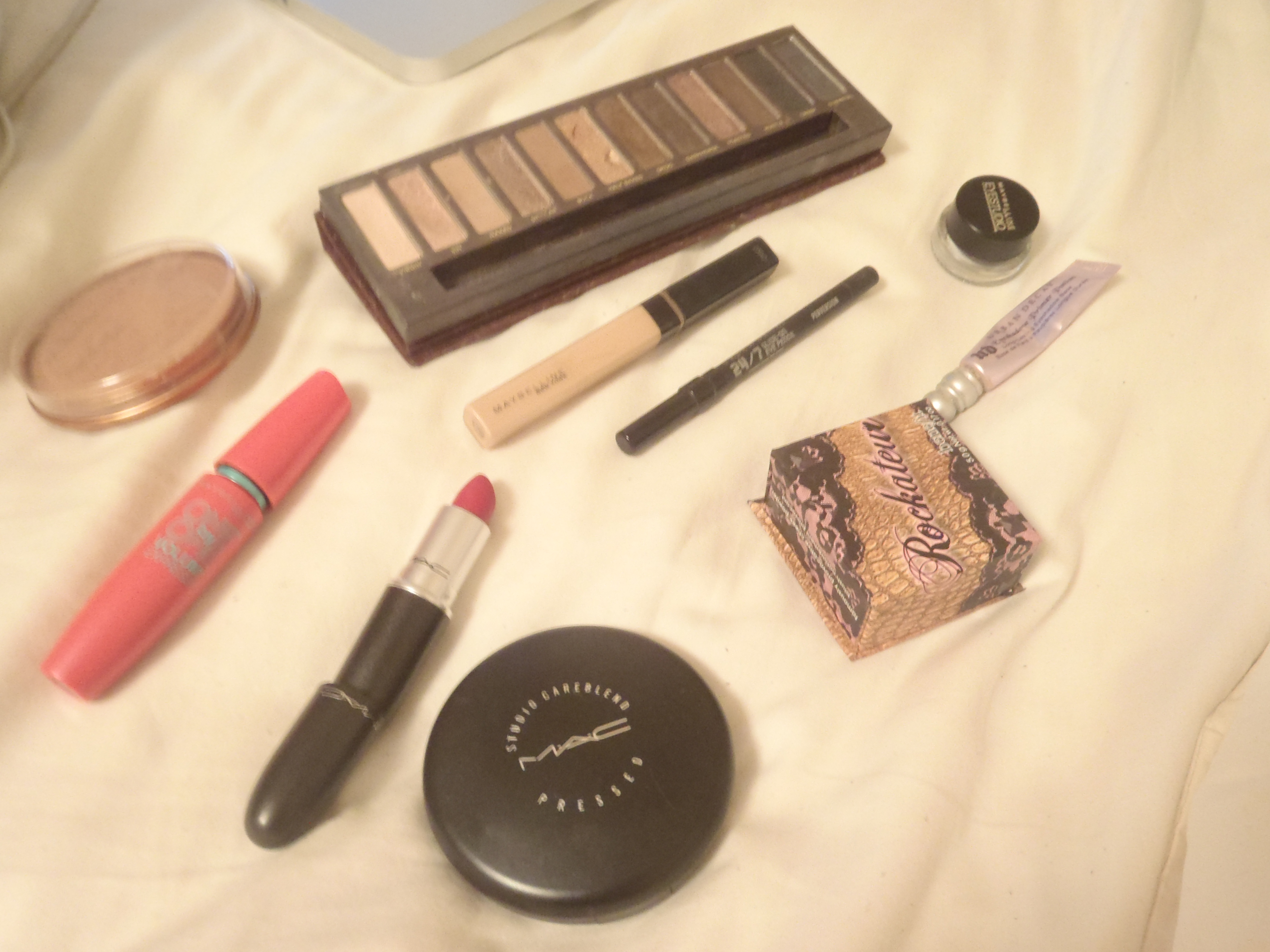 FACE: Lancome La Base Pro Primer, Make Up For Ever HD Foundation in 115, MAC Studio Careblend Pressed Powder in Light, Rimmel Match Perfection Highlighting Concealer in Ivory, Rimmel Natural Bronzer in Sun Light, Benefit Girl Meets Pearl Highlighter, Maybelline Hi-Lighting Bronzer in Deep Bronze BROWS: Urban Decay Naked eyeshadow w/ a bit of Buck on the outside portion EYES: NYX HD Eyeshadow Base, Urban Decay Naked 1 Palette (Buck, Sin, Toasted, Smog & Darkhorse), Rimmel Scandaleyes Eyeliner in Brown, Lancome Le Crayon Khol in Black Ebony, Maybelline The Falsies Mascara LIPS:MAC Patisserie Lipstick